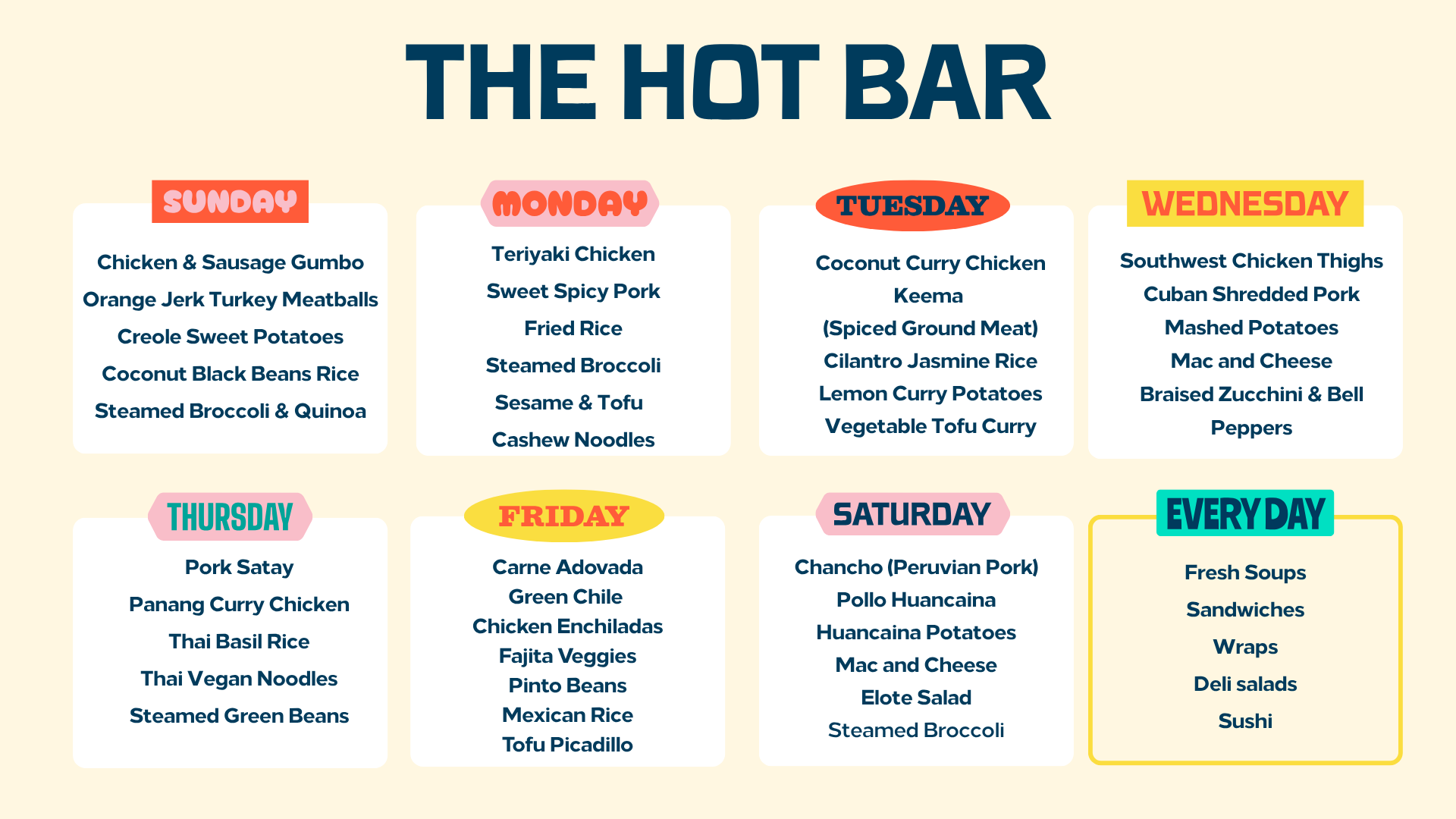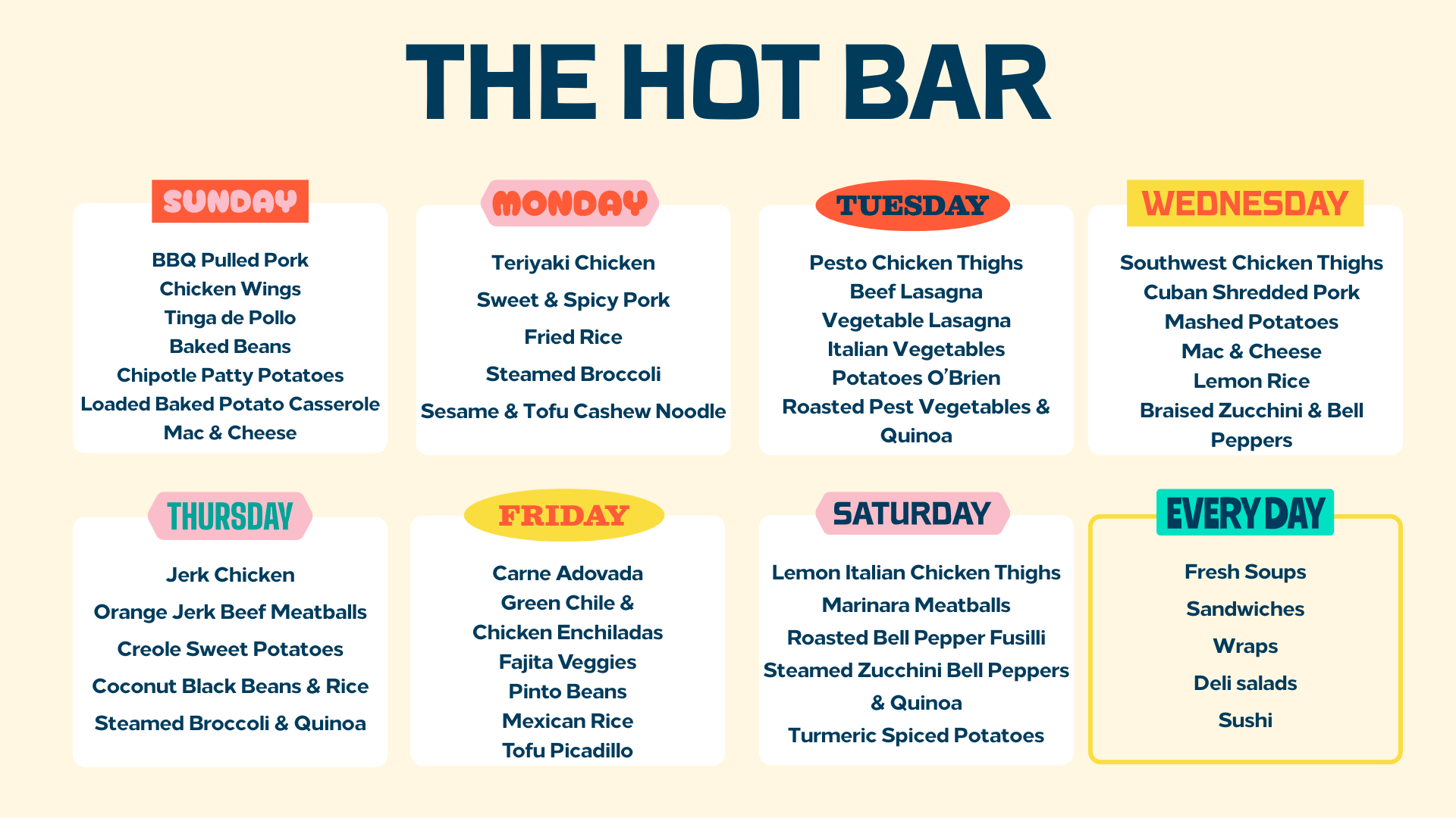 Fresh made soups, sandwiches, wraps, salads, sushi, and heat and serve meals available all day in the deli section.