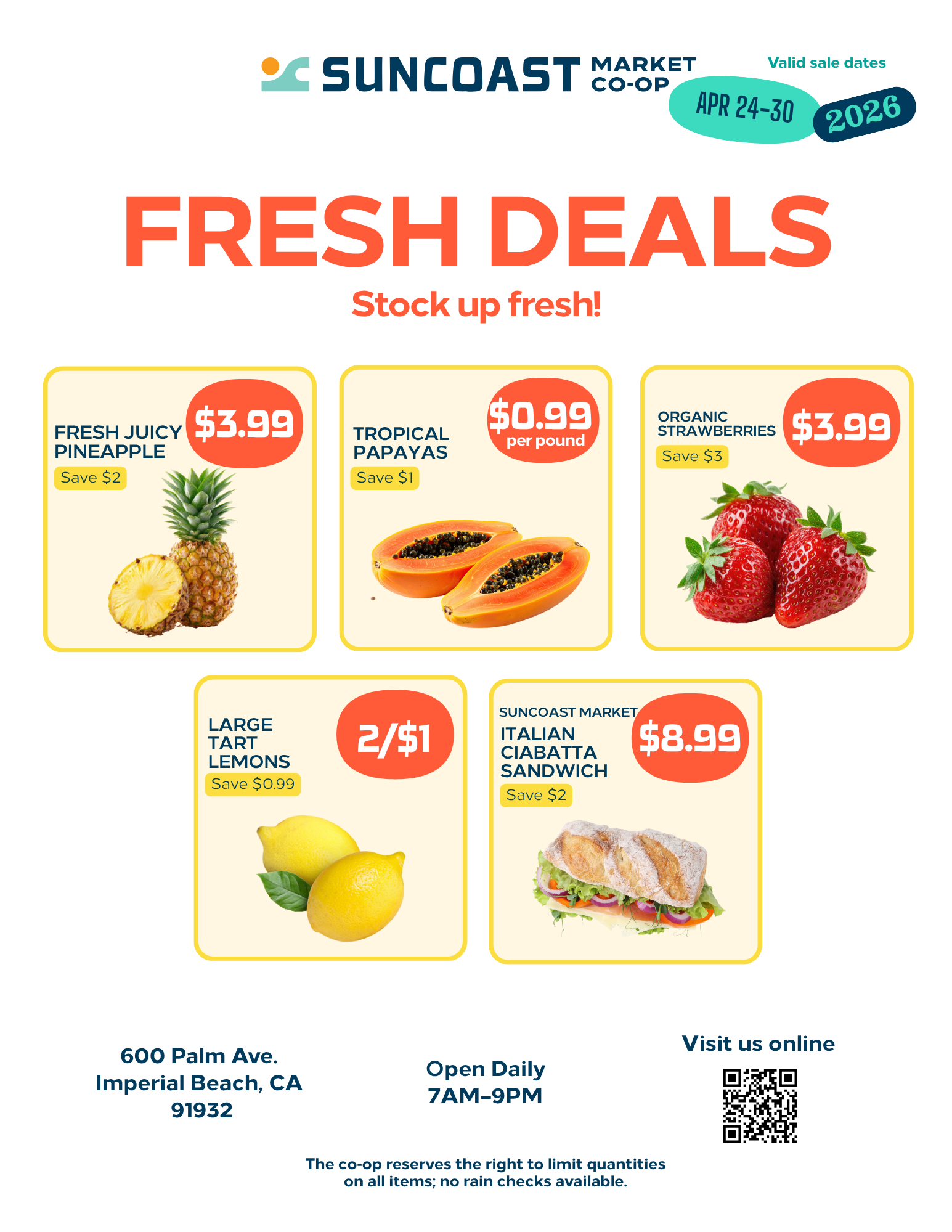 Check weekly for the very best deals from all over the store. Visit the store for additional in store specials. Sign up for our newsletter to receive our Market Deals flyer straight to your inbox.