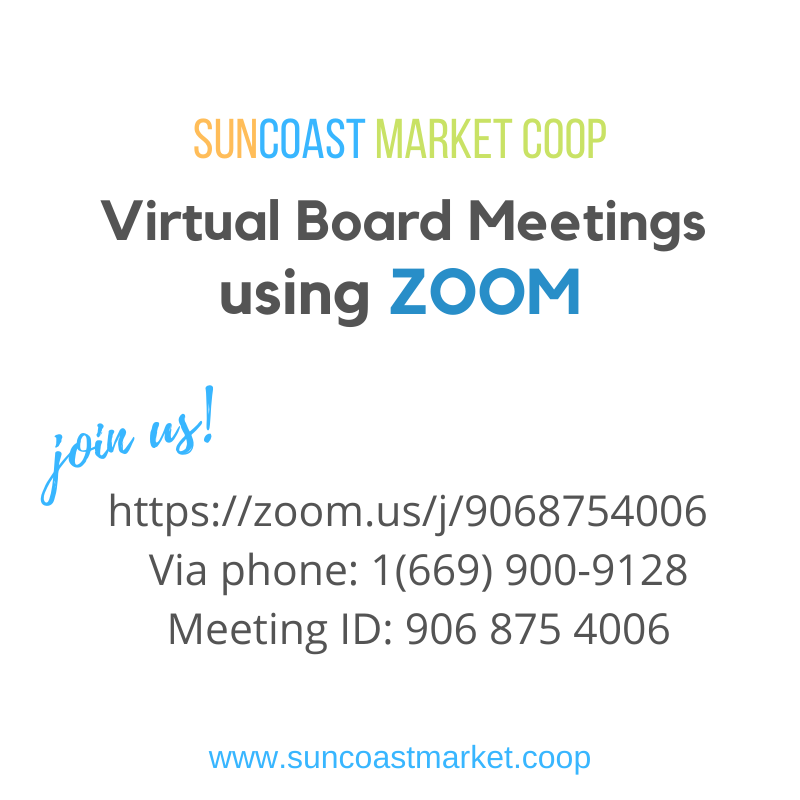 Please join the SunCoast Board of Directors in a community update on our location search and progress toward opening our store. This meeting is open to all (owners and not-yet owners). Time for Q&A will be available. Join Zoom Meeting https://us02web.zoom.us/j/9068754006... Meeting ID: 906 875 4006 Passcode: SunCoast One tap mobile +16699009128,,9068754006# US (San Jose) […]